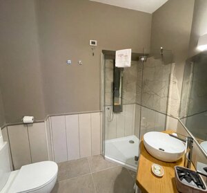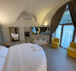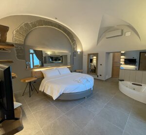 letto tondo, dotata di angolo cottura, bagno con doccia a vetri, phon ed accessori Dyson, cassaforte, aria condizionata