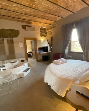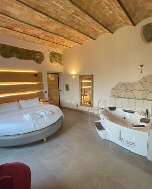 Una suite di 40 mq. dotata di letto tondo e vasca idromassaggio ai piedi del letto