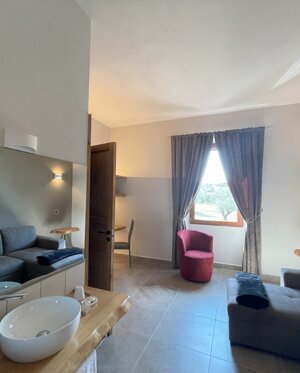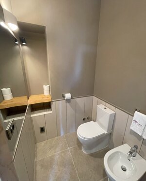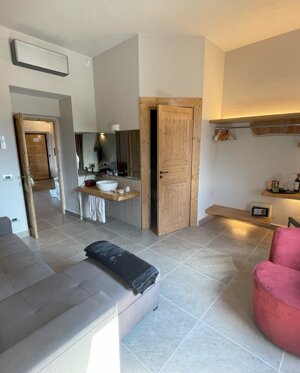 tetto a voltine, una doccia incassata nel muro alle spalle della vasca, la seconda stanza con divano e scrivania, cassaforte, frigorifero, aria condizionata, phone ed accessori Dyson